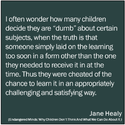 Please remember that when children “learn too soon using a form other than the one they need” there can be grave damage to a child’s long-term academic and social emotional development. When making good decisions about instruction and learning; we must also take into consideration a child’s developmental readiness to learn. tlb